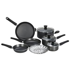 Nonstick inside and out for easy cleaning, this 10-piece cookware set outfits a kitchen with the basics while permitting healthful, low-fat cooking. The set consists of a 8 inch saute pan, a 9.5 inch saute pan, a 11 inch saute pan, a 1-quart saucepan with lid, a 2-quart saucepan with lid, a steamer, and a covered 5 quart Dutch oven that doubles as a pot for cooking pasta, simmering stock, or making soup. Lids are vented, made of tempered glass, and have knobs that adjust to vent steam for controlled cooking. Ergonomic handles made of tough plastic stay cool on the stovetop and are oven-safe to 350 degrees F. They're welded, with no inside rivets to trap food, and have hanging holes. Though inexpensive, the cookware is handsome and stylish, with charcoal gray exteriors and charcoal black interiors. Bottoms resist warping for uniform heating without hot spots. This cookware carries a lifetime warranty against defects, excluding dishwasher damage. --Fred Brack What's in the Box 1-quart saucepan with lid, 2-quart saucepan with lid, 5 quart Dutch oven with lid, 8-inch sauté pan, 9.5-inch sauté pan, 11-inch sauté pan, and steamer